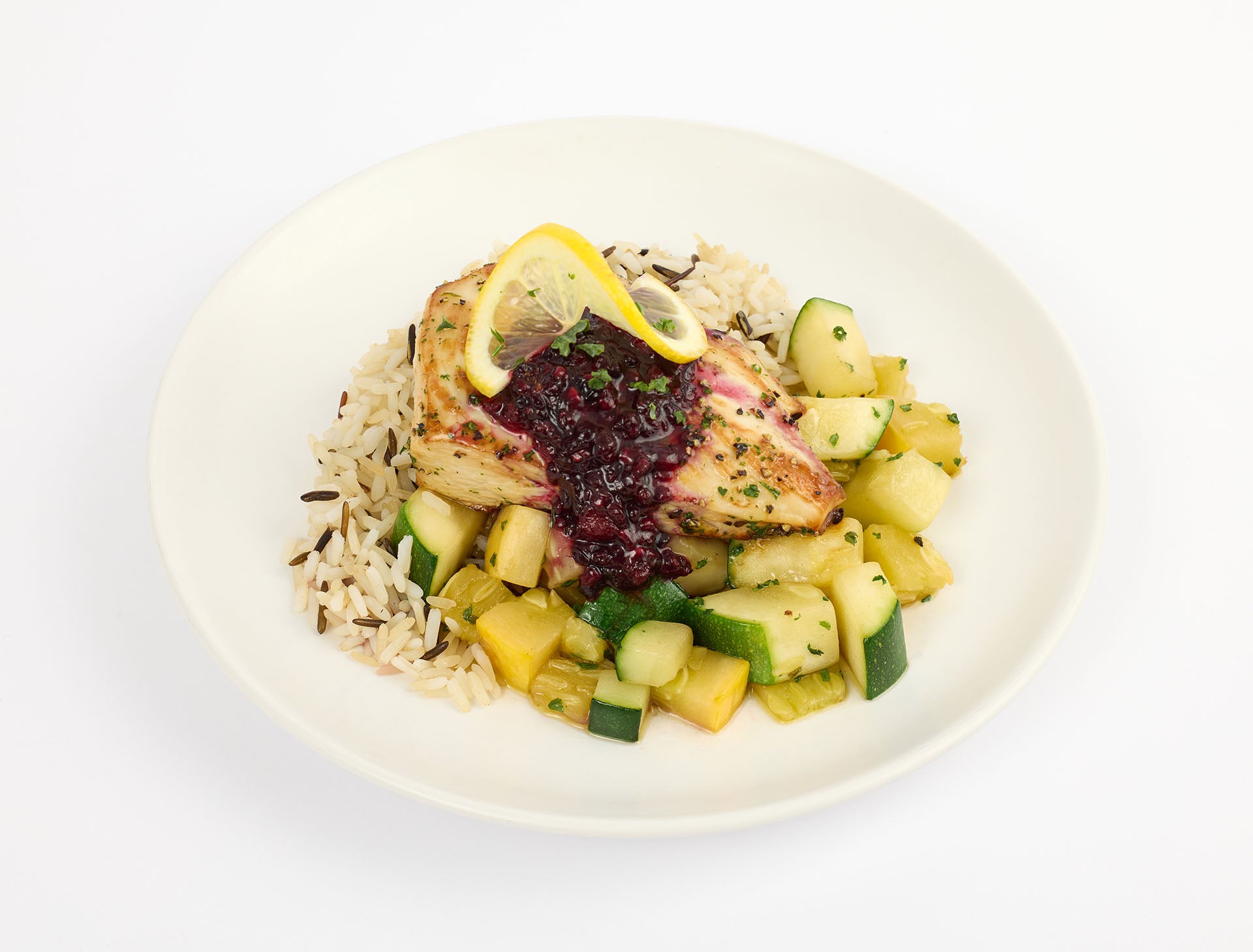 | Ingredient List | Summer Squash Mix (Squash, Zucchini, Onion, Red, Avocado Oil, Spice), 1% Fit Grilled Chicken Breast (1% Fit Chicken Breast (Chicken, Kosher Salt, Spice), Garlic, Reduced Sodium Salt, Spice), Wild Rice F (Water, Wild Rice), blackberry sauce (Blackberries, Water, Honey, Spice, chicken base, gluten free, Parsley), Parsley |