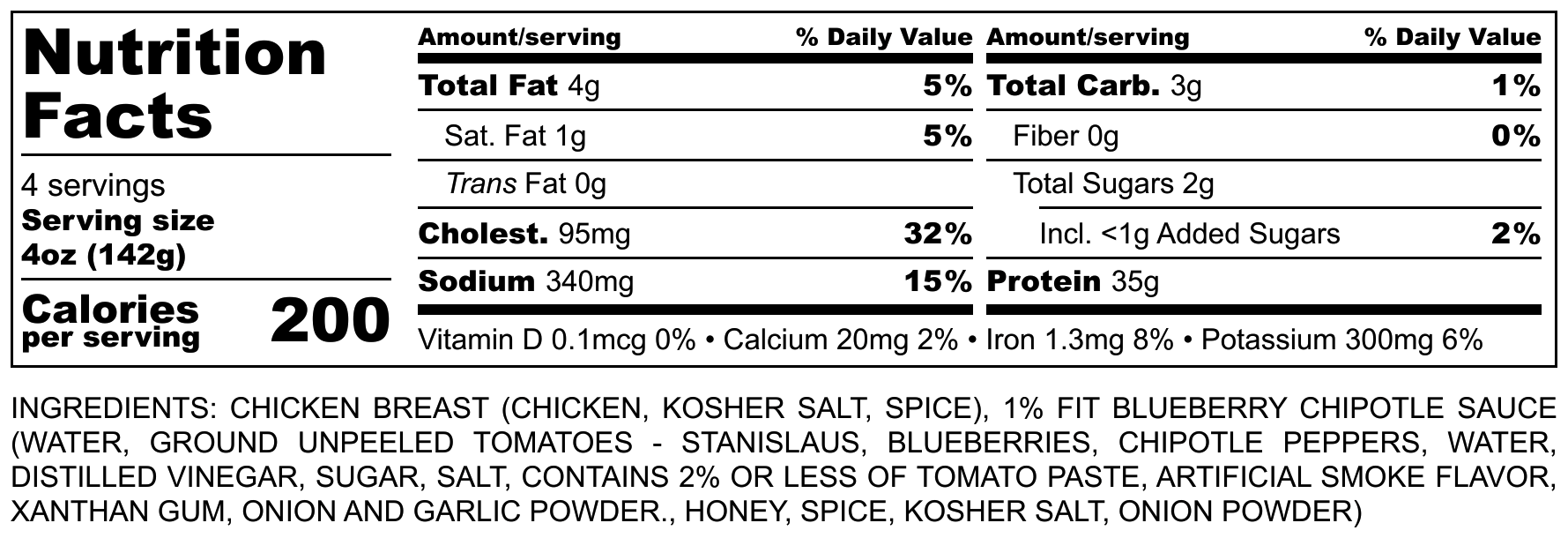 Sous-vide and grilled to perfection, then coated in our house-made Blueberry Chipotle Sauce for an irresistible flavor that’s sure to satisfy your taste buds. Our antibiotic & hormone-free chicken offers the highest quality on the market. Each pack includes 16 oz of tender, juicy chicken breast.
