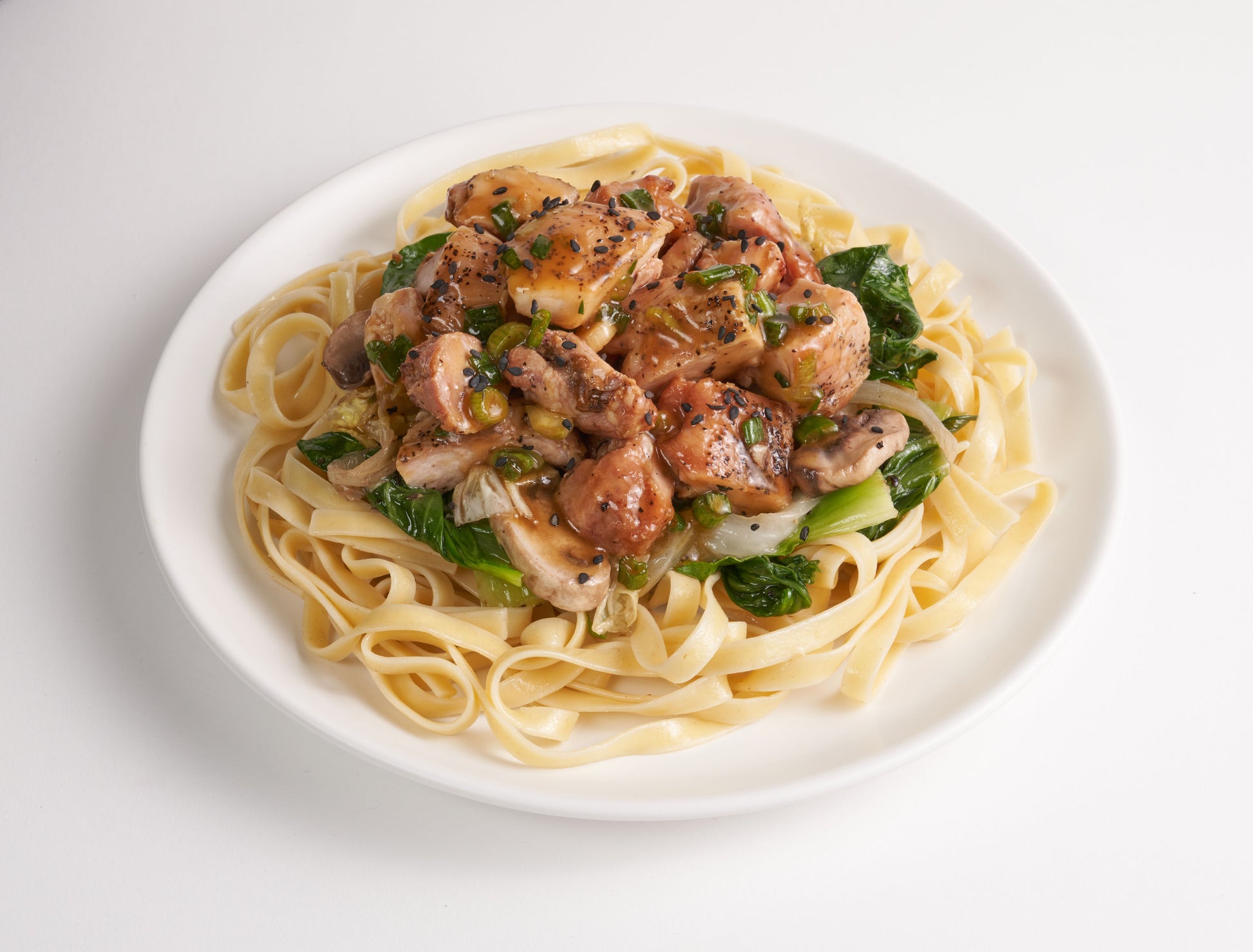 | Ingredient List | Chicken Thigh F (Chicken, Garlic Powder, Spice), Asian Blend F (Mushrooms, Cabbage, bok choy, Onions, Olive Oil, Black Pepper, Reduced Sodium Salt), Chow Mein Sauce F (Chicken Broth, Scallions, Rice Vinegar, San-j Tamari Gluten Free Soy Sauce, Fish Sauce (Anchovies, Salt), Garlic, Ginger,, Toasted Sesame Oil, Guar Gum), Fettucine WW F (Barilla Fettucine, Olive Oil, Reduced Sodium Salt), Almonds |