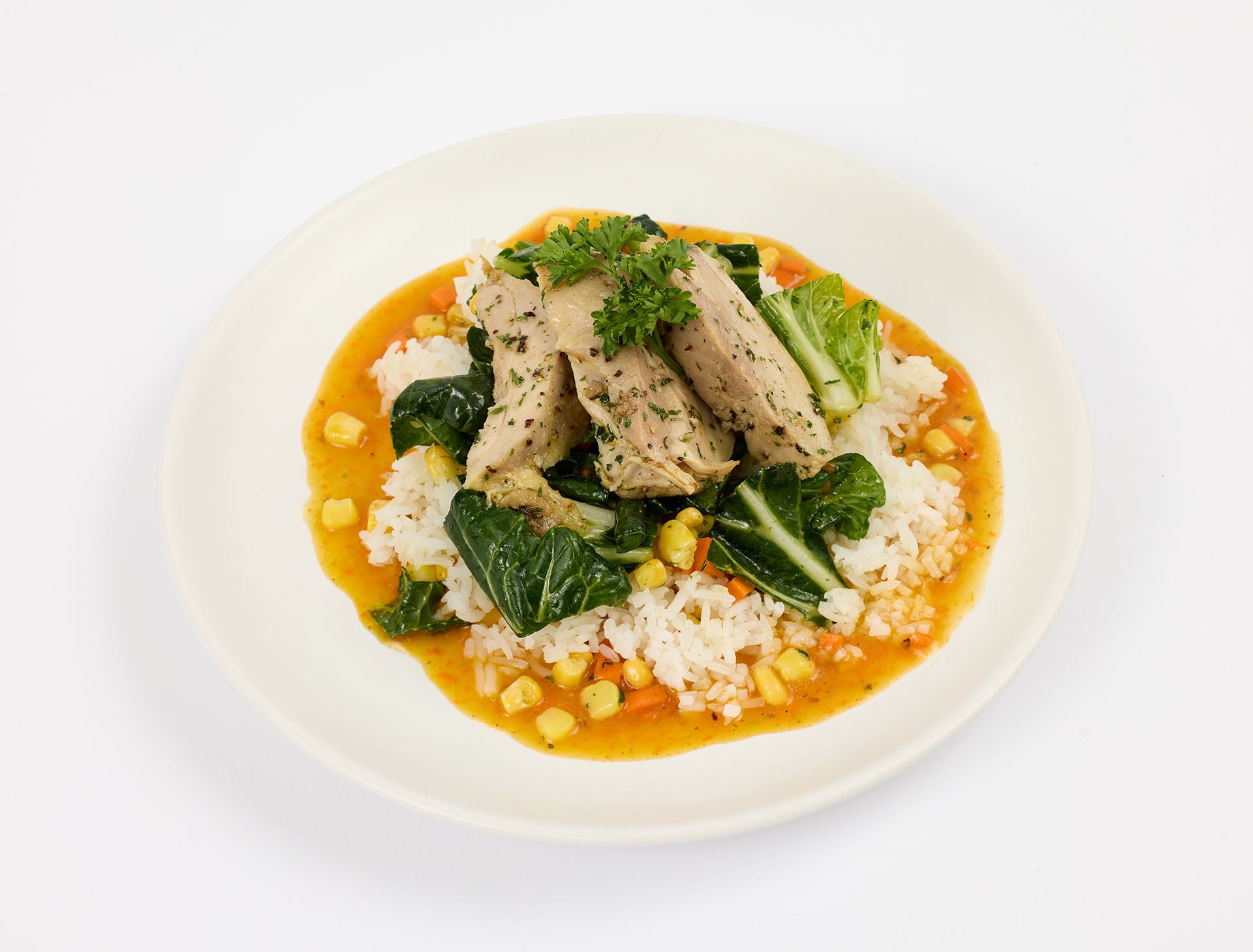 | Ingredient List | Chicken Thigh F (Chicken, Garlic Powder, Spice), Saffron Blend (Roasted Carrots F (Carrots, Olive Oil, Reduced Sodium Salt, Black Pepper), Corn, bok choy), Quinoa, Saffron tomato stew base (Water, Fire Roasted Tomatoes, diced, Dry Sherry, Celery, Roasted Carrots F (Carrots, Olive Oil, Reduced Sodium Salt, Black Pepper), (Onions, Olive Oil), Flavor, chicken base, gluten free, Spice, ground coriander, Cumin, Black Pepper, Oregano, Saffron), Feta (pasteurized milk, nonfat milk, salt, cheese culture, enzymes, calcium chloride), Parsley |